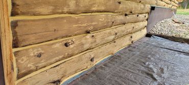 Corn cob blasting water stains from the interior of log home.