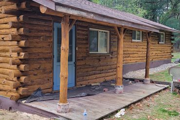 Corn cob blasting stain from the front porch of log home.